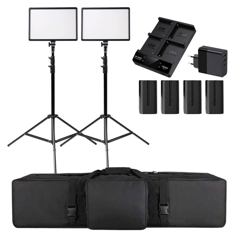 Ett komplett portabelt ljuskit byggt kring två LED-paneler på 50W styck, perfekt när du behöver stabil och batteridriven belysning utan att vara beroende av vägguttag. Panelerna kan drivas med NP-F970-batterierna som ingår i paketet eller via nätström, vilket gör det enkelt att växla mellan studio- och fältarbete. Färgtemperatur och ljusstyrka är fullt justerbara, och panelerna monteras snabbt på de medföljande stativen via 16 mm-fäste.