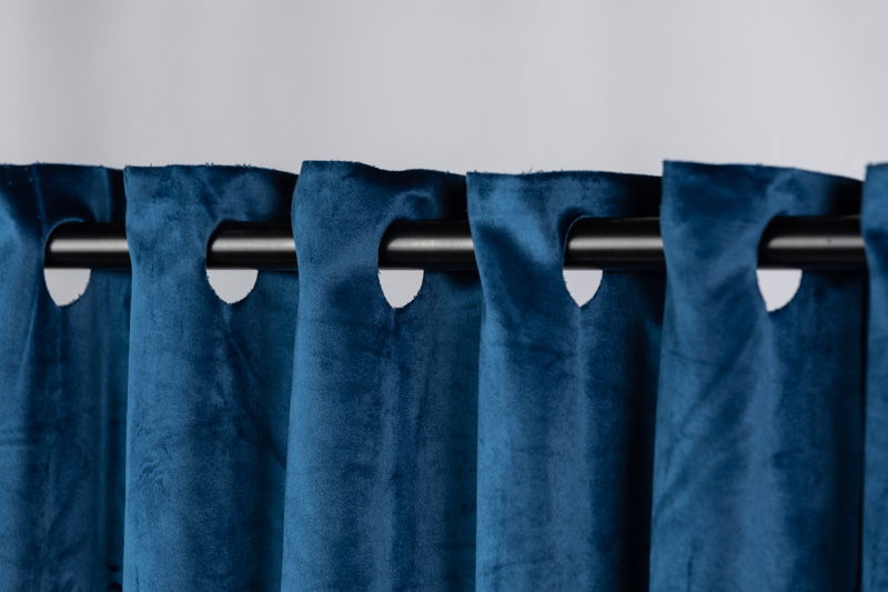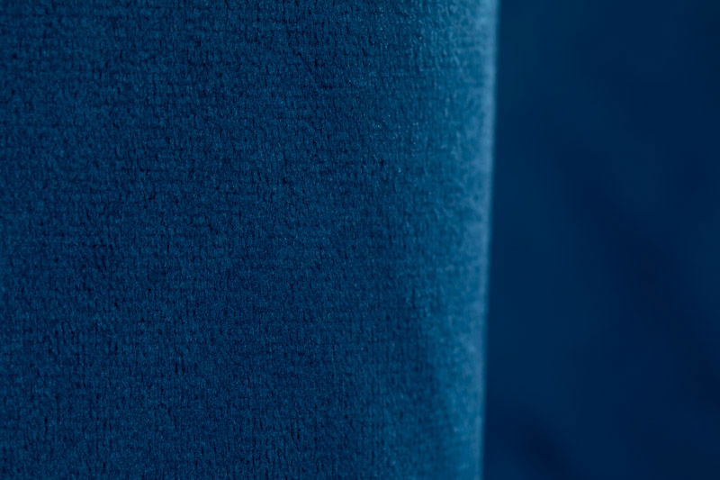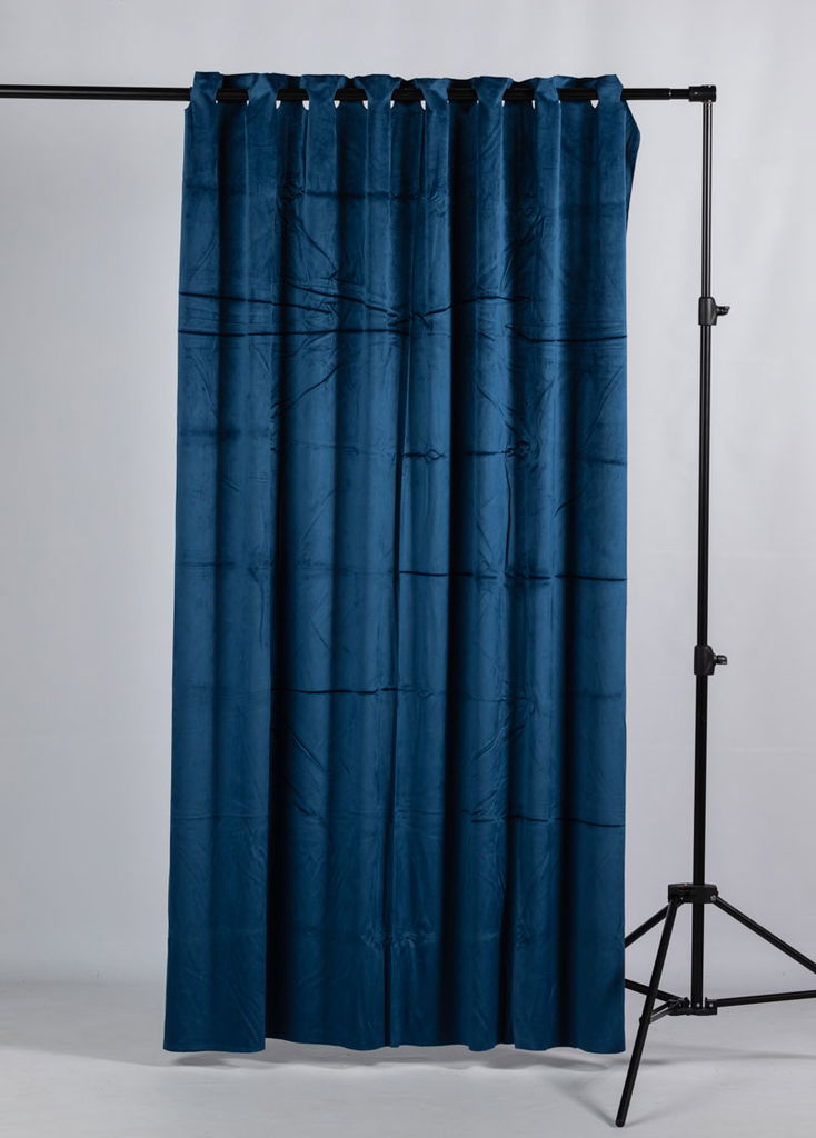 En djupblå/marinblå tygbakgrund av gardintyp för produktfoto, porträtt och styling. Draperiet hängs upp likt en gardin på bomarm eller bakgrundsstativ.