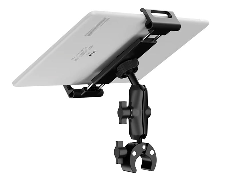 Kraftig klämma som kan gripa om 16-27.5 cm - vilket gör att den funkar både med iPads och med större mobiler.
