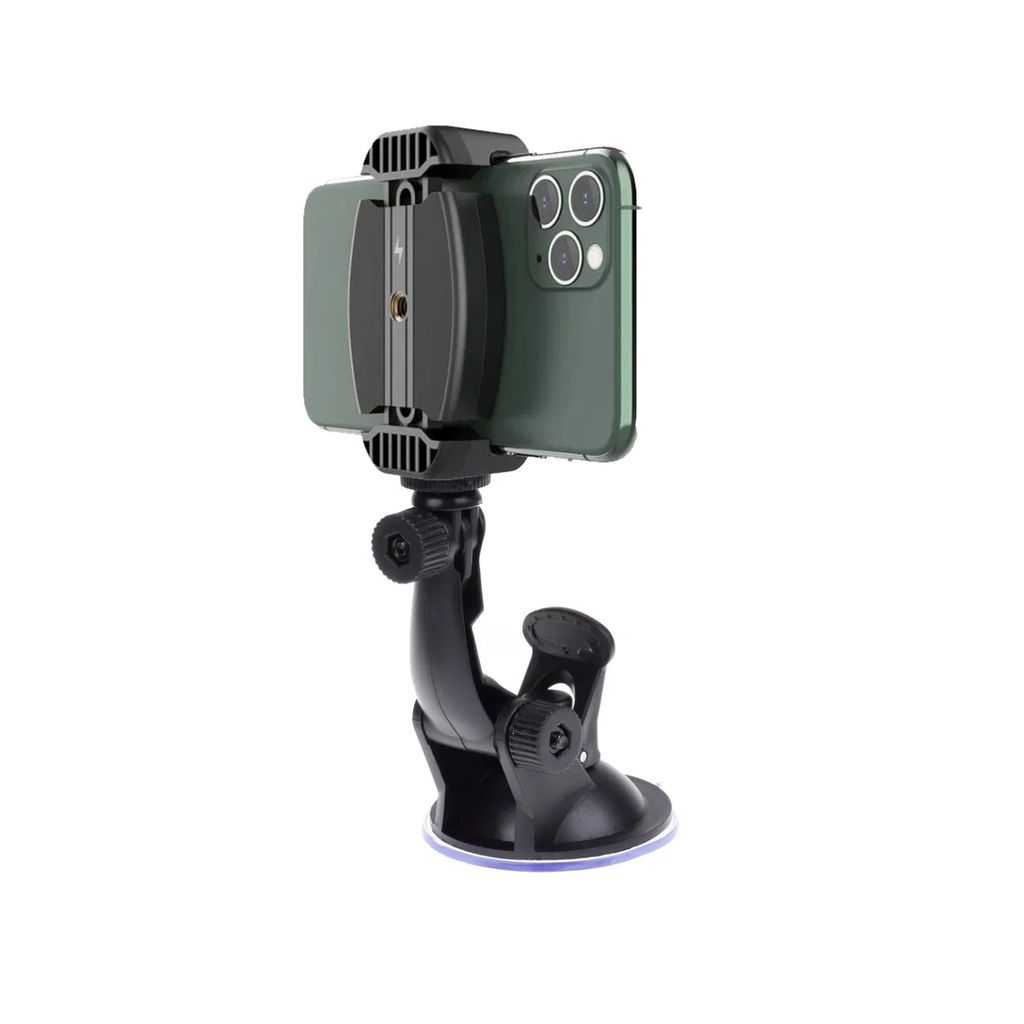 Mobilhållaren bygger på Ulanzi ST-13 med integrerad trådlös laddningsplatta och flera monteringsmöjligheter via 1/4”-gängor och tillbehörssko. Sugproppsfästet ger en stabil montering på släta ytor som bilrutor, kaross, bränsletank eller båt, med två leder som gör det enkelt att justera vinkel och position.