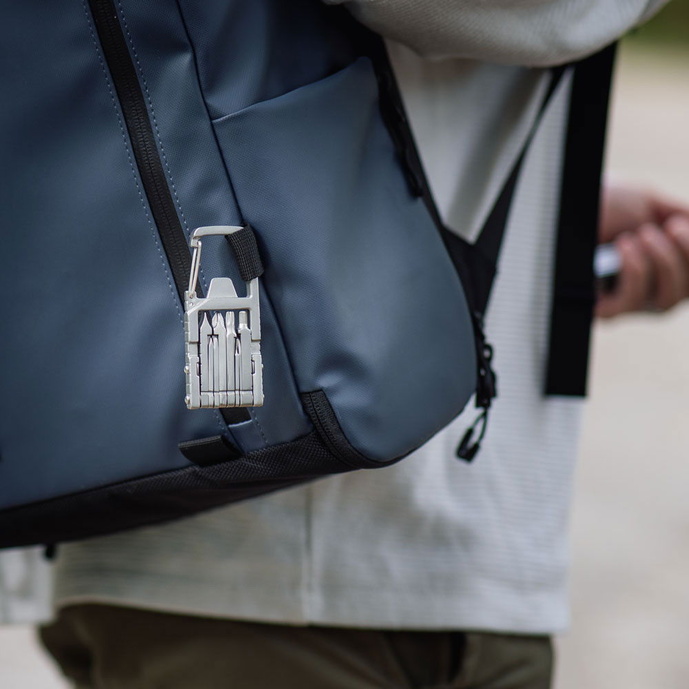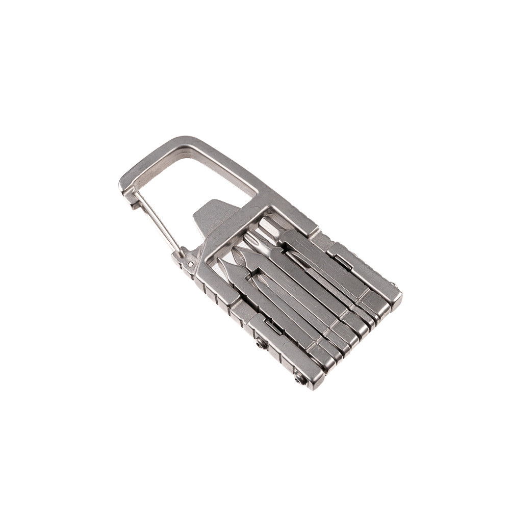 Multiverktyget kombinerar karbinhake med användbara funktioner som flasköppnare, skruvmejsel, insexnyckel, linjal, kniv och flera andra verktyg. Perfekt för snabba justeringar av utrustning, mindre reparationer eller när du bara vill öppna en kall dryck ute i naturen.