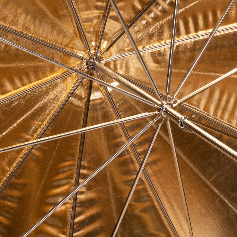 Extra stort paraply med guldfärgad insida och svart utsida.