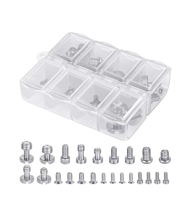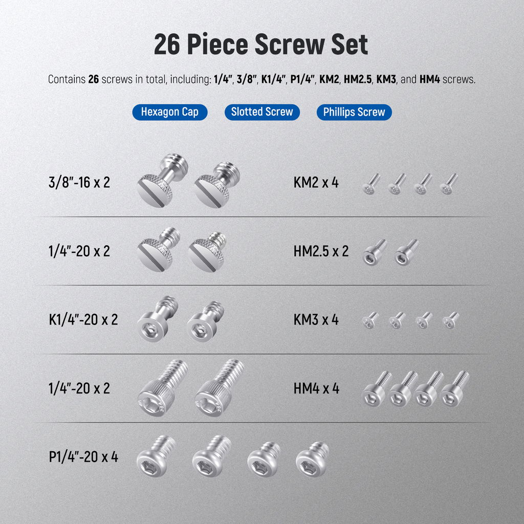 NEEWER 26PCS Camera Screw Set är ett komplett och praktiskt kit för fotografer och videografer som vill vara förberedda på allt. Oavsett om du bygger riggar, knackar ihop en monitorarm, reparerar ett stativ eller behöver en snabb ersättningsskruv på setet, innehåller detta set de vanligaste gängorna: 1/4", 3/8", M2, M2.5, M3 och M4.