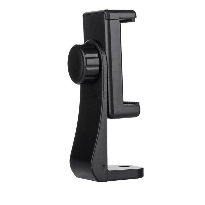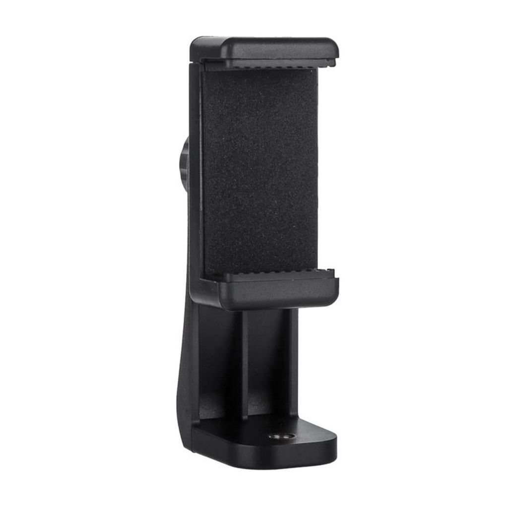 Mobilhållare i plast som passar smartphones mellan 58-85 mm. Kan rotera och tillåter filmning och fotografering både horisontellt och vertikalt. Skruven på baksidan låser fästet i önskat läget. Ej tiltbart.